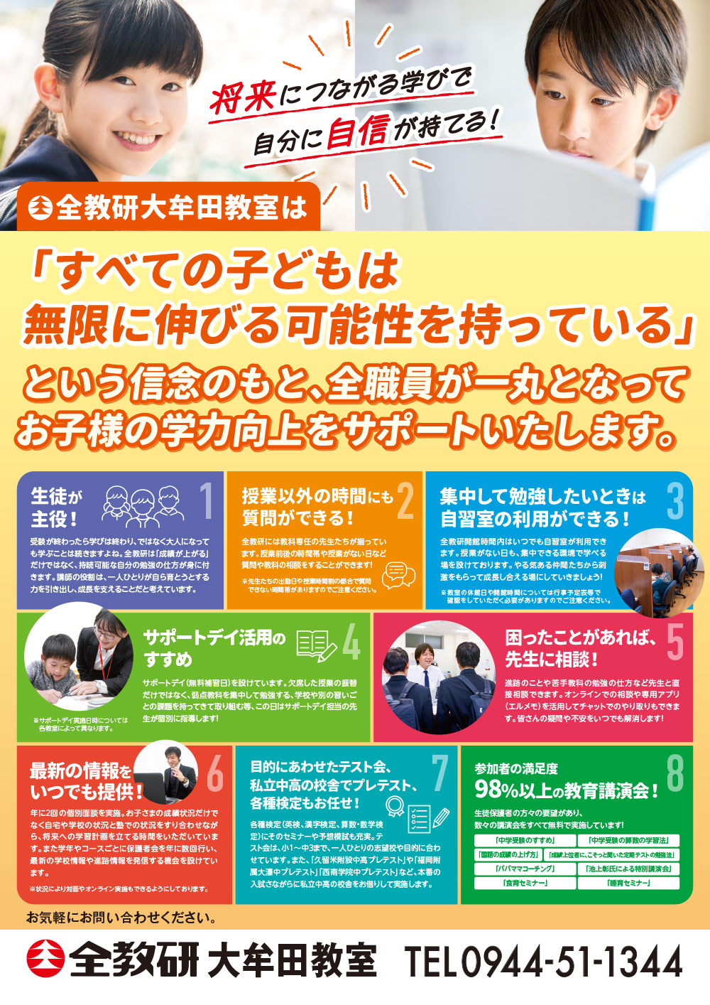 大牟田教室では「すべての子どもは無限に伸びる可能性を持っている」という信念のもと、全職員が一丸となってお子様の学力向上をサポートいたします。同じ目標を持つ仲間とともに切磋琢磨し、夢や目標を追いかけてみませんか?
