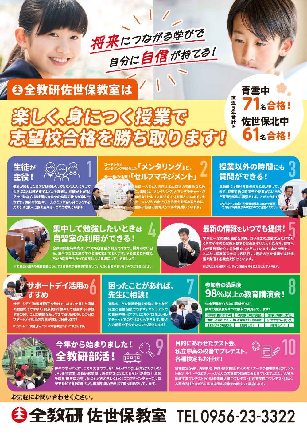 全教研佐世保教室は、目標に向かってがんばるお子さんが多く通っていらっしゃいます。難関・有名私立中学受験、佐世保北中受検と、皆さんが友達として、ライバルとして日々切磋琢磨しています。