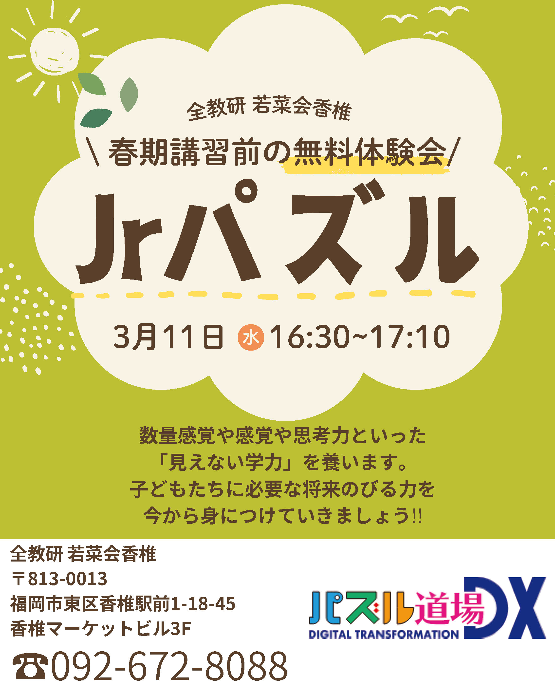 ※若菜会香椎は、全教研香椎本部教室(小中学部)と併設していますので、小学生になってからも、通い慣れた教室で頑張りたい講座を続けてご受講いただけます!